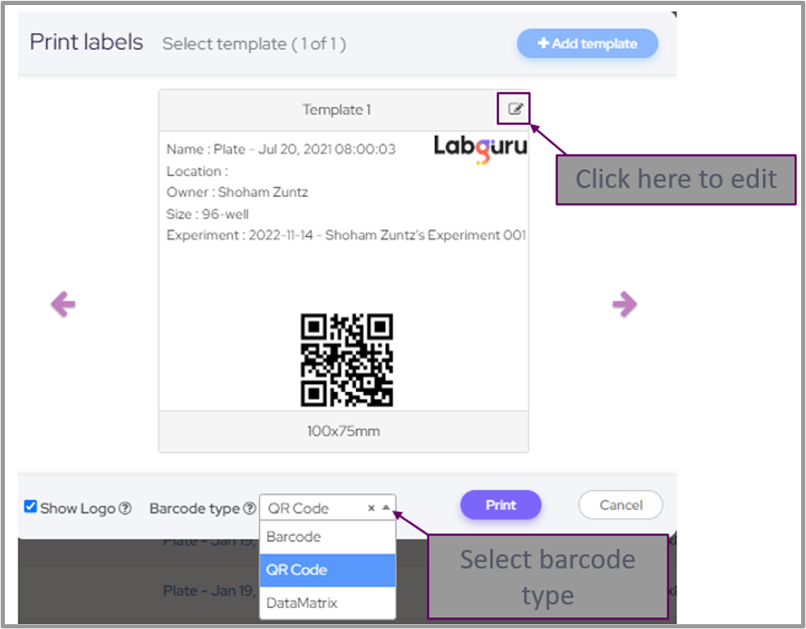 2. After clicking on 'Print labels' the Label printing wizard feature will open to allow admins to edit and create their own template: