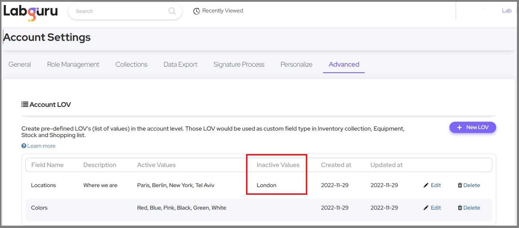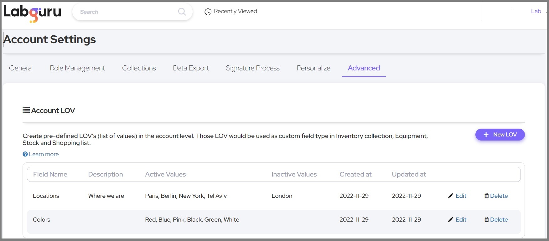 A List of Values (LOV's) is a list of several parameters that can be used in multiple locations in your Labguru account. Account LOV's can be created once and then used in any collection you might need. This can save you the time and trouble of setting and maintaining this list in multiple locations.