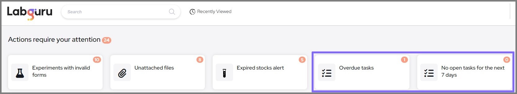 A member with open or overdue tasks assigned to them, will be notified on Labguru's main page in 'Actions require your attention'.