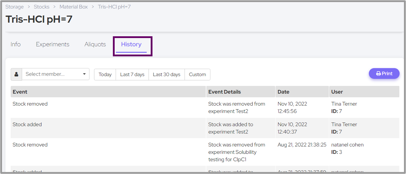 On the stock page History tab, you can find all the actions done on a stock since it's creation.