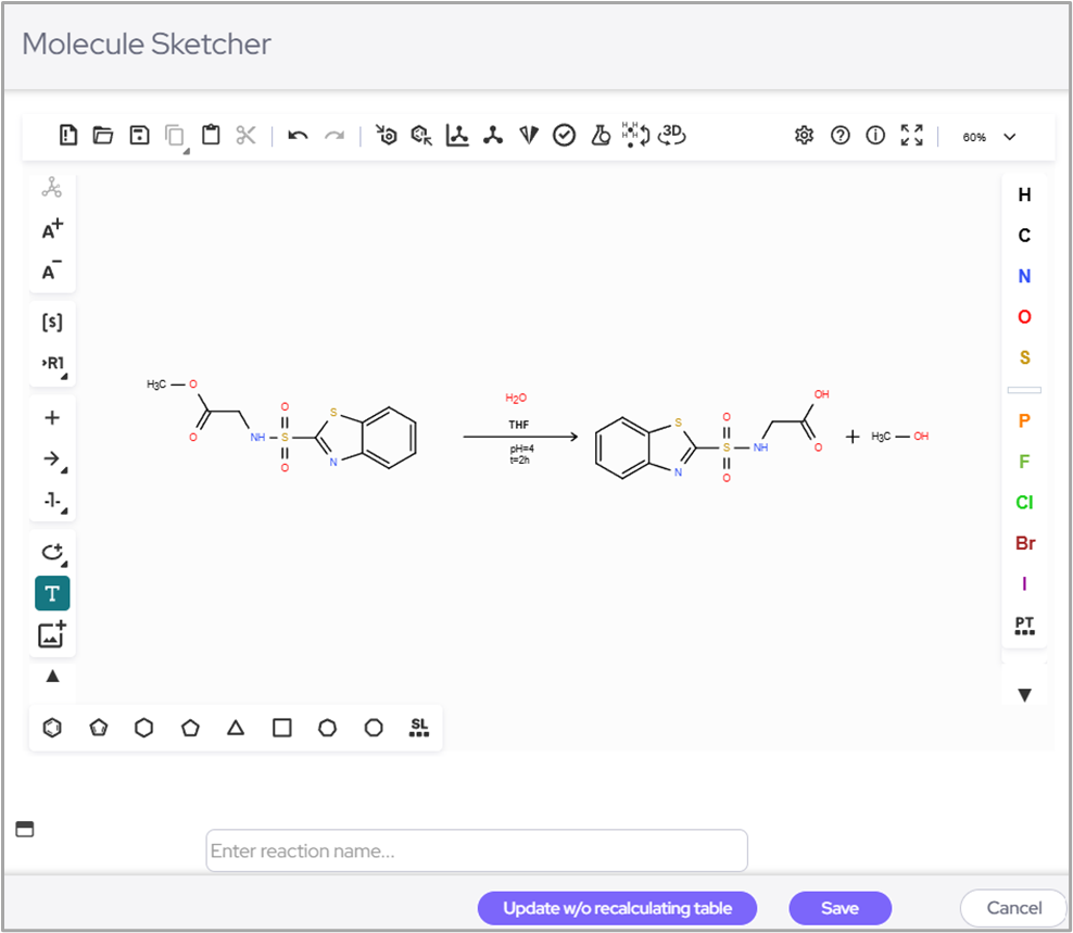 You can add an individual compounds chemical structures and/or reaction schemes directly into your protocol experiment using Ketcher, Labguru's integrated Chemical editing tool. Using this tool you can draw or import the structure of each molecule, describe a reaction, and use the added stoichiometric table to get a yield calculation based on the reactants and product quantities (volume or weight) and the mole ratio of the reaction.