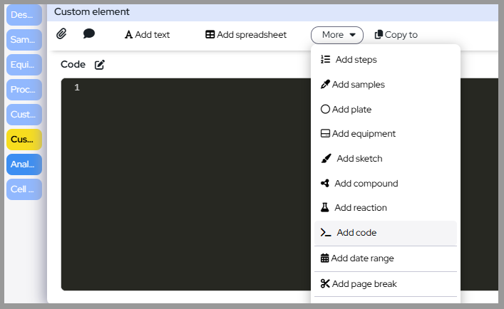Keep tack of the code you create in Labguru! You can add the code element and have easy access to your code, the results and any additional aspects of your work within a single experiment page.