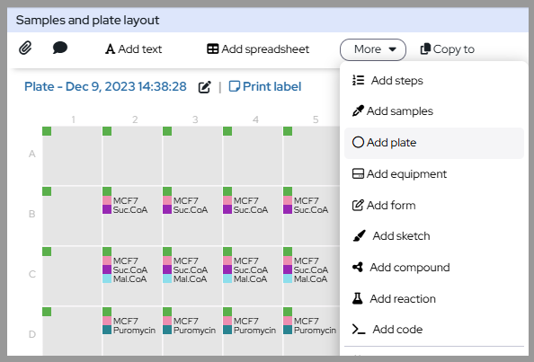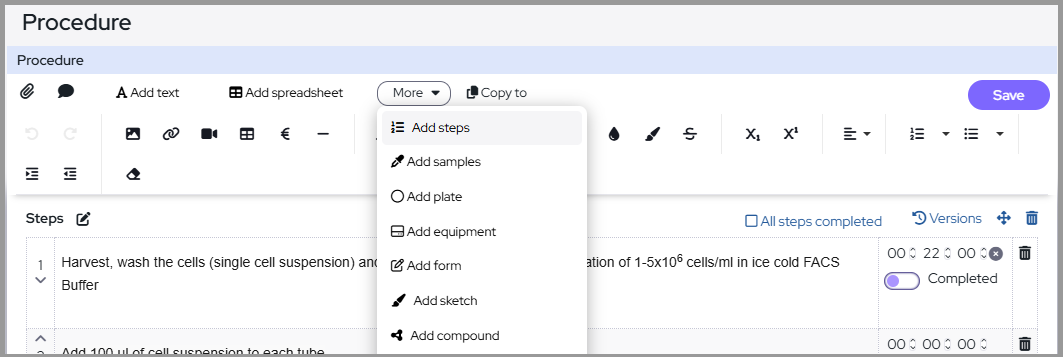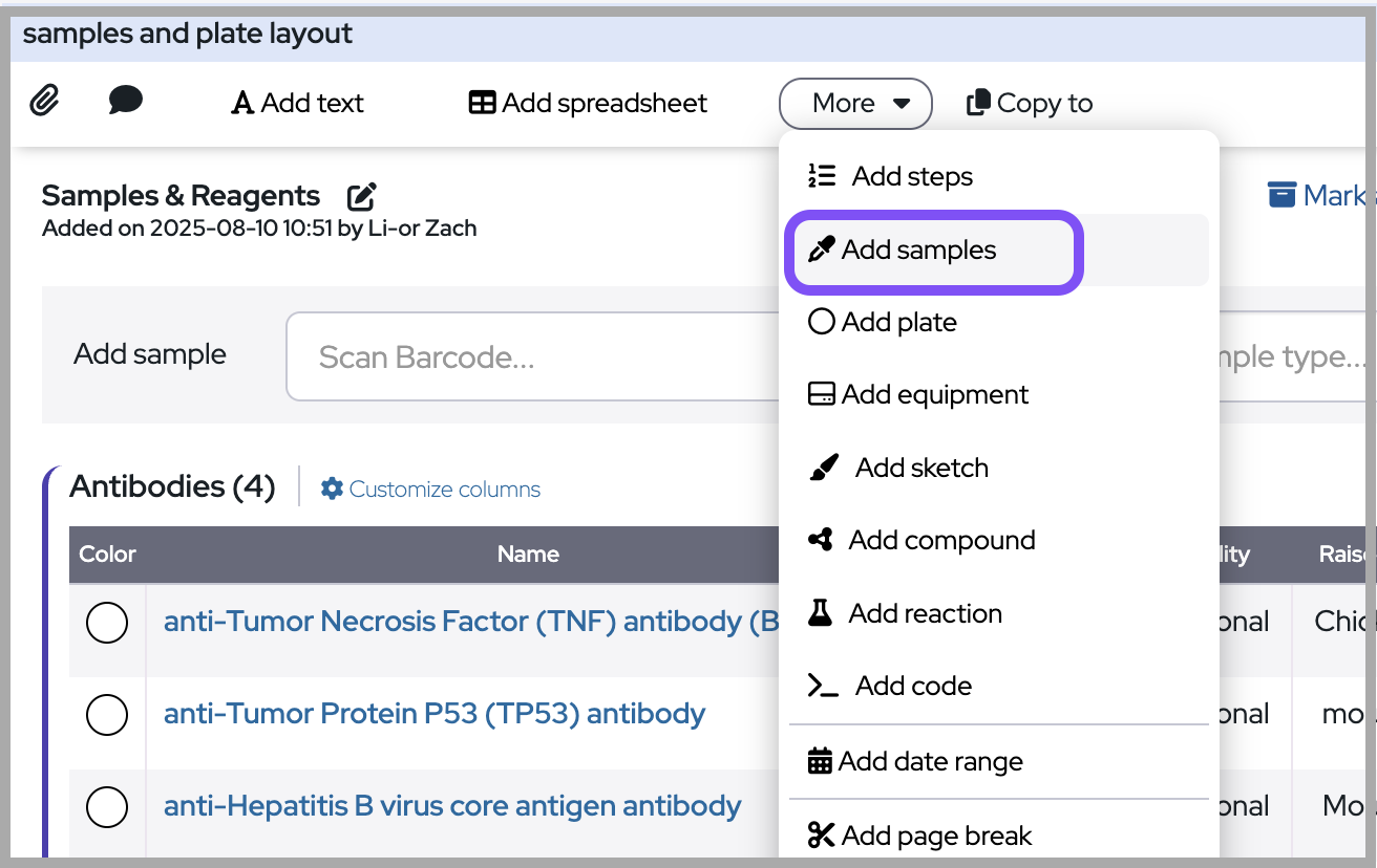 Adding samples to your work is a great way to link between your inventory and your experiments. In the sample element you can efficiently document what you're using interactively, without opening cabinets and storage units. Using this element will allow you to keep an accurate record of your used and unused samples in real time.