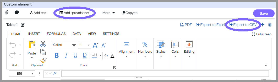 The spreadsheet element of the ELN offers basic Excel functions and exclusive advanced options. In this element you can create functions, graphs, sort and filter your data. Each spreadsheet element is also available to be exported as a CSV file.