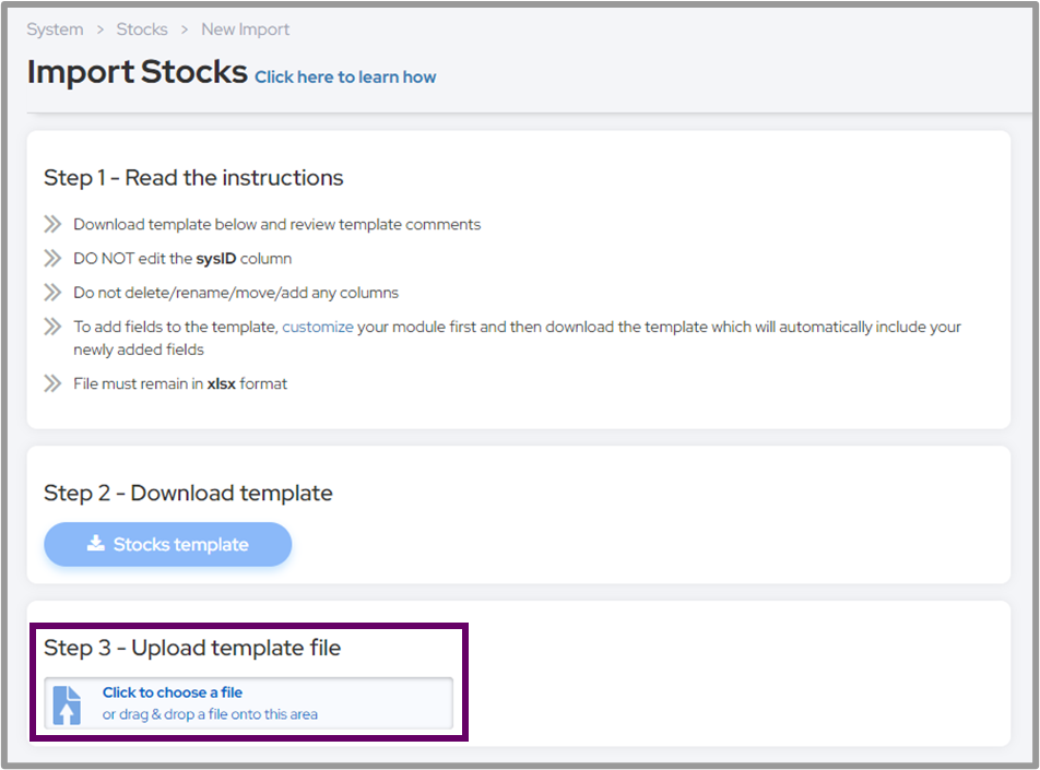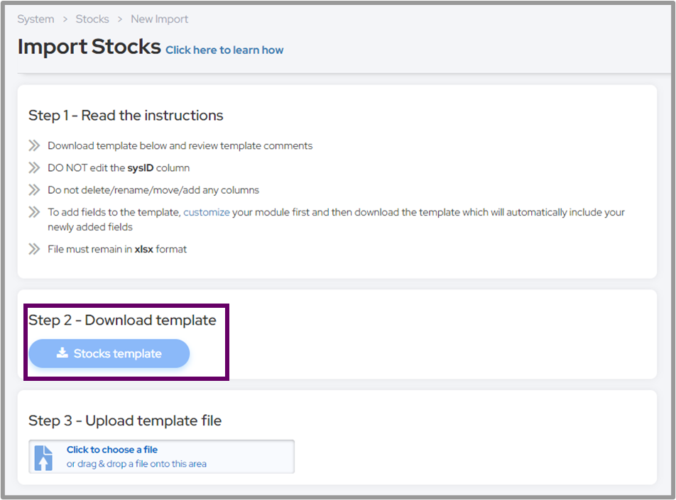Before importing stocks, ensure that all inventory items are registered in Labguru with a unique System ID (Sys ID), which allows accurate mapping during data import.