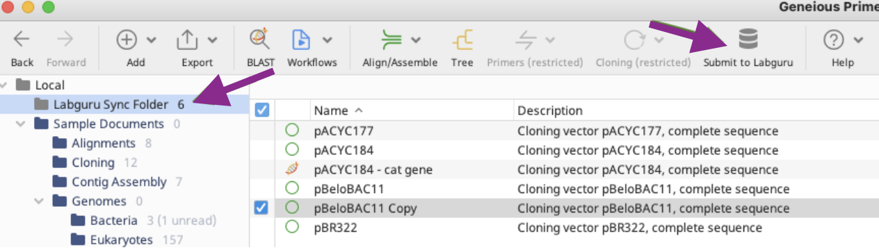 This plugin will add a 'Submit to Labguru' button to your Geneious Prime top bar. This allows you to upload plasmids into Labguru Plasmids collection directly from Geneious Prime, simply by selecting the plasmid and submitting it.