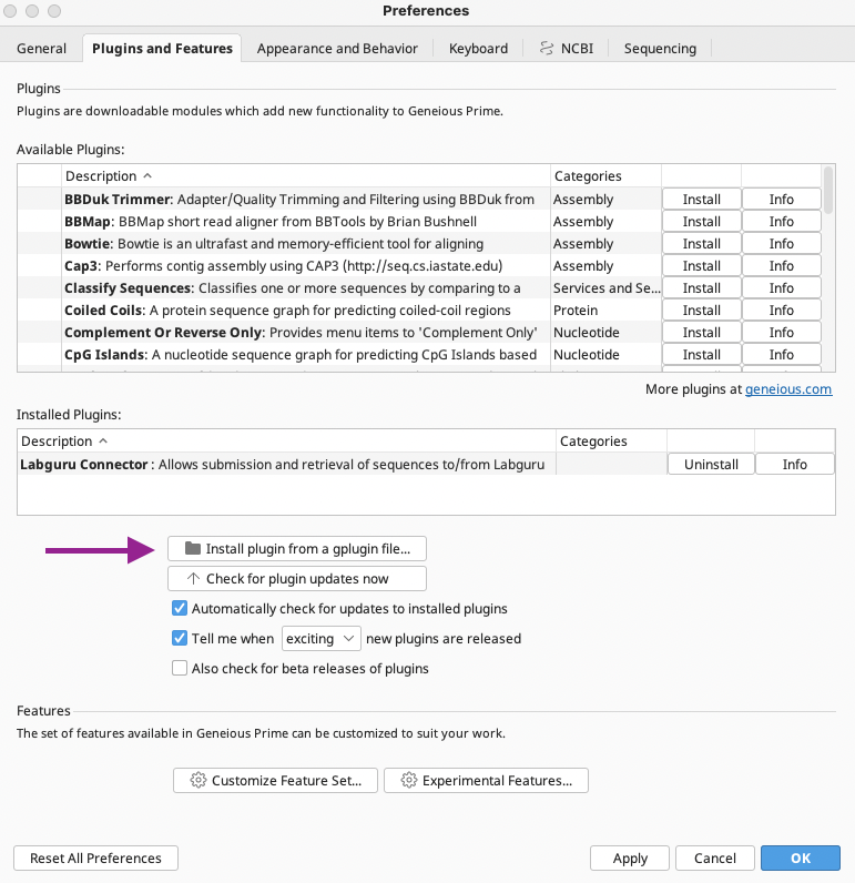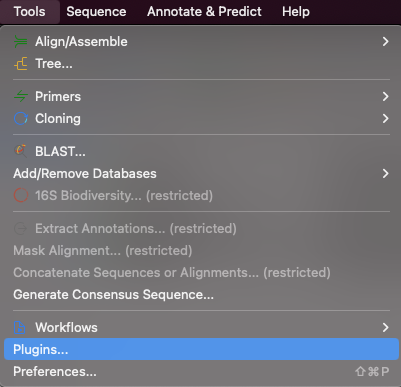 Go to Geneious Prime top bar and click on Tools -> plugins.