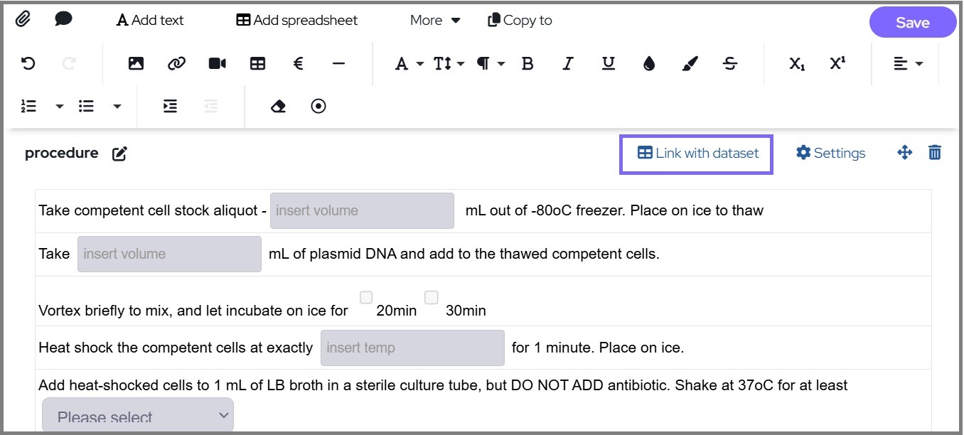 Once the link is created, you can start a new experiment from the protocol, populating the Form and linked dataset.
