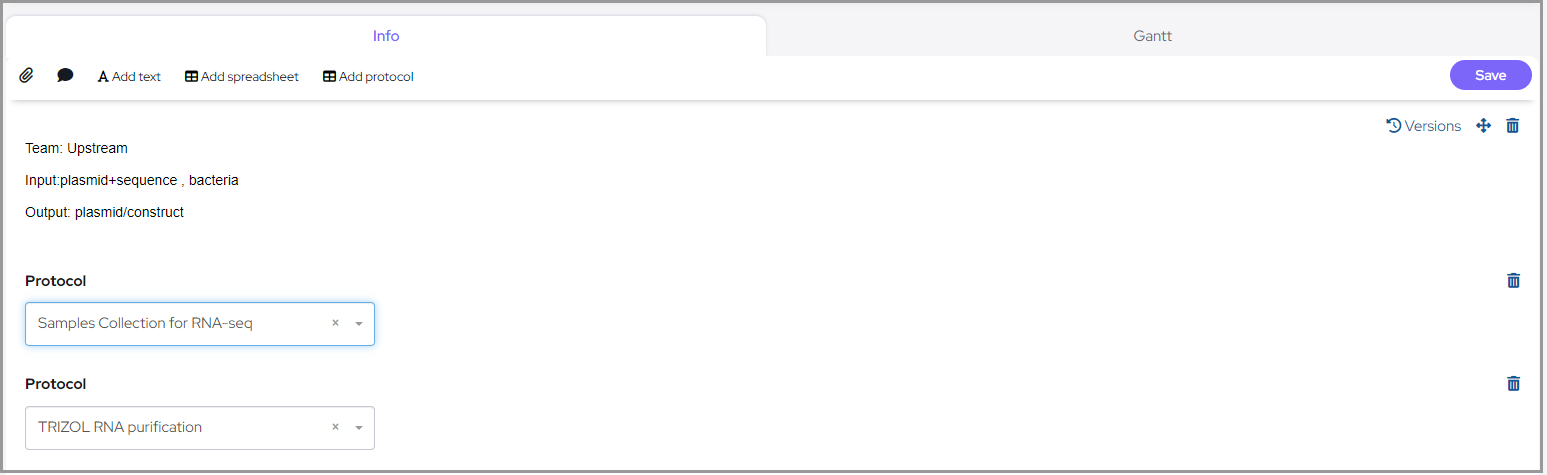In order to create the schedule, you can use the Gantt tab, there each protocol will have a block that represents duration. The chart is dynamic and allows making changes by moving the blocks, in addition it is possible to create associations between blocks to create a mandatory order of completion.