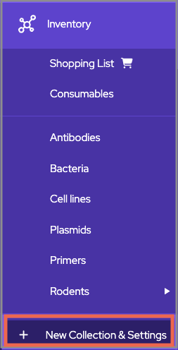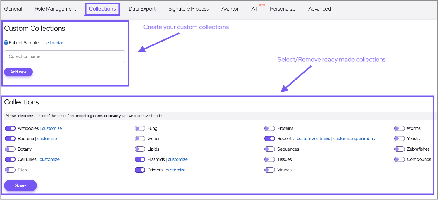 2. Manage your inventory list, select or remove collections from the default list Labguru offers, and create new custom-made: