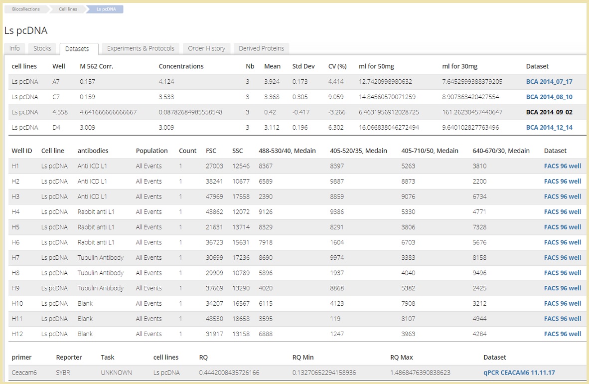 Datasets allows you to connect the actual results from data files you attached to experiments to inventory items. When you add an attachment as a Dataset, Labguru will then scan the dataset and locate all inventory items that appear in it. It will then add the relevant data from the file (the row where item appears) and will display it in a new tab in the item's page (named 'Datasets'). This will give you a great overview of all the data that was collected in your lab on a specific item.