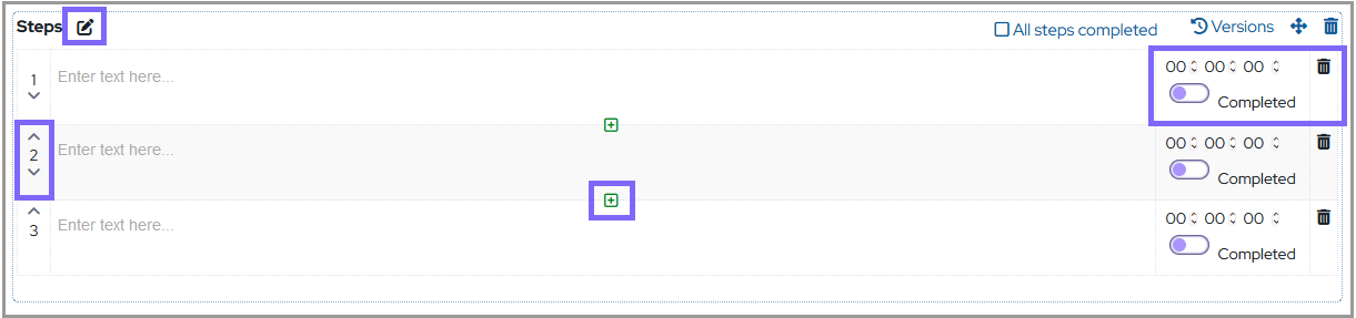 Each step can be marked as completed using a "completed" checkbox, alternatively all the steps can be marked using the "All steps completed" checkbox.