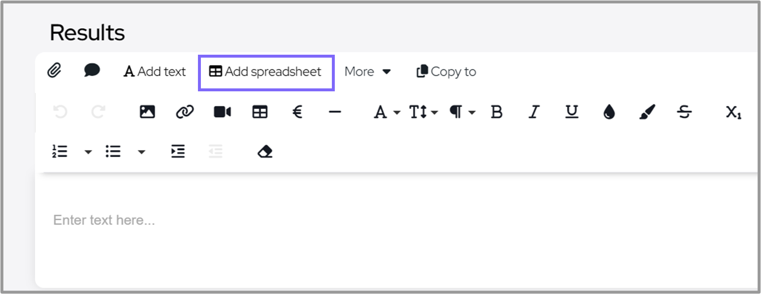 To add a spreadsheet element to your experiments and protocols, click on ‘Add spreadsheet’ located at the top of every section: