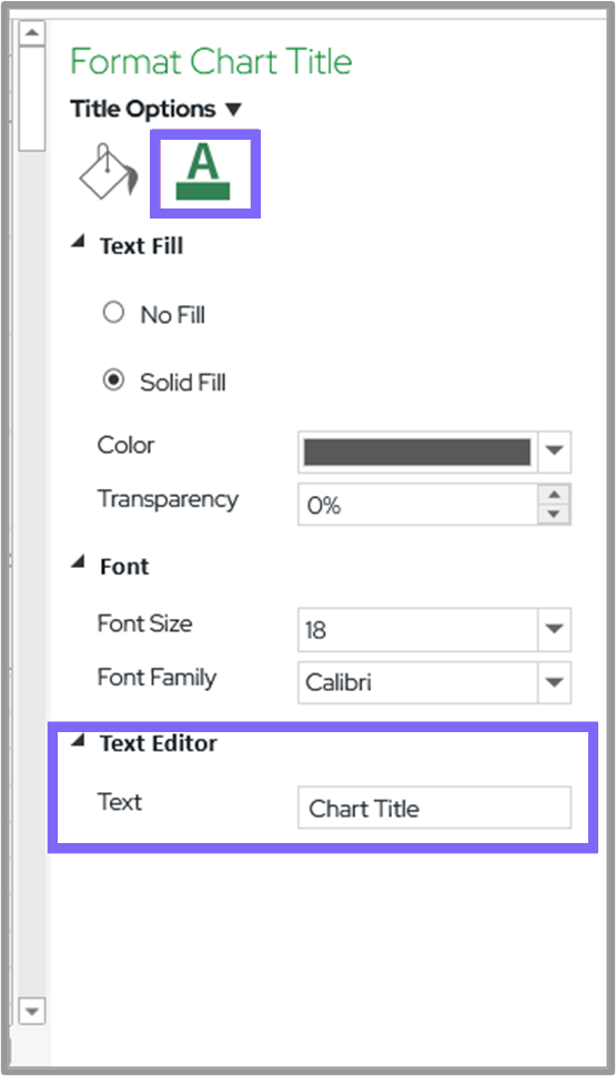 Chart formatting possibilities are available, such as colours, borders, size, and text formatting as well as chart title and legends addition.
