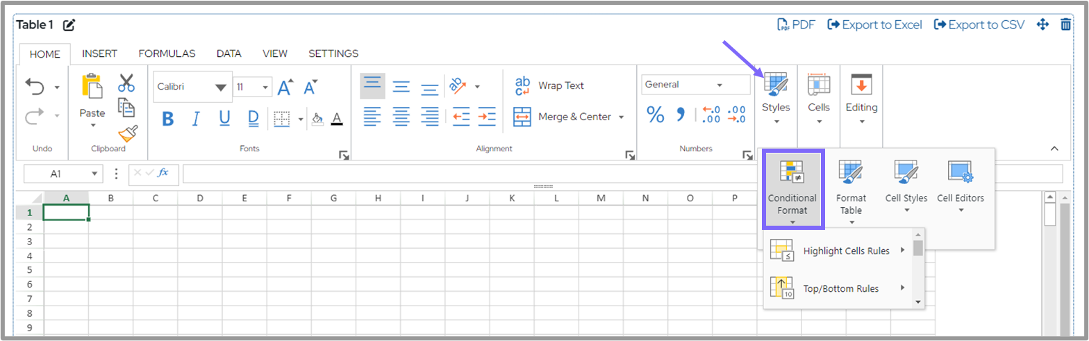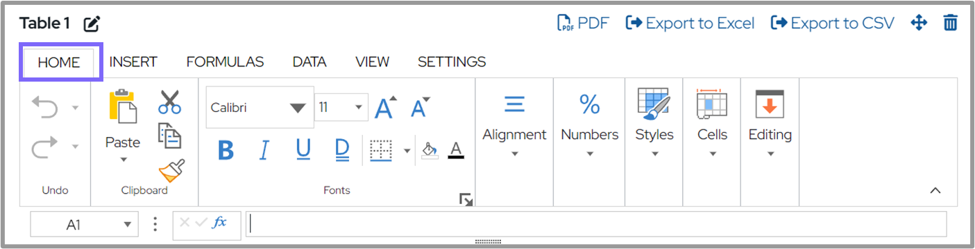 The Home tab allows you to cut, copy, and paste, as well as set cell formatting and conditional formatting. You can add and format tables, sort, filter, and search.