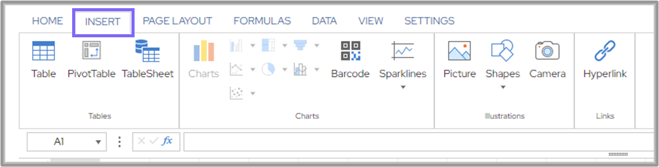 The toolbar is divided into tabs. Each tab gathers a variety of tools and Excel-like applications.