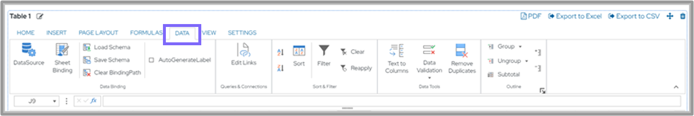 The Data tab allows you to sort, filter, group, validate data, load or save schema, and bind a table using a template.