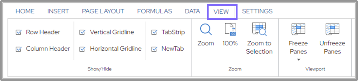 The View tab allows you to hide or show headers, gridlines, the tab strip, and the new tab option. You can also zoom and freeze rows and columns.