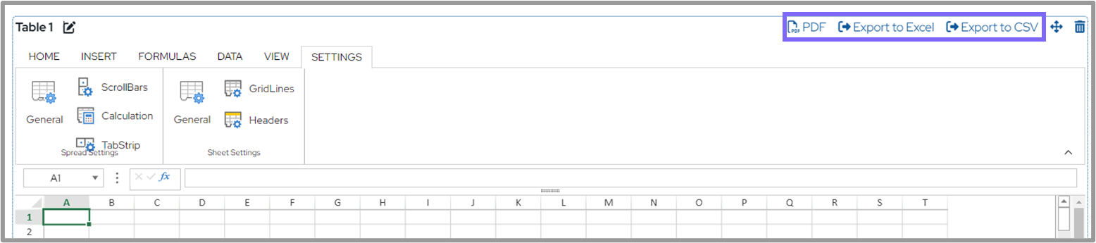 The Settings tab allows you to set options for the sheet or the entire workbook. You can set options for the tab and scroll bars. You can specify the number of columns and rows and frozen rows and columns. You can also set the selection policy.