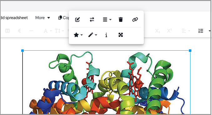 Added images can be edited by clicking on them, it is possible to resize, change their alignment, make them links, replace or delete them. The annotation tool allows to crop images, add text and drawings on them.
