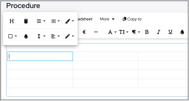 Using "Table headers" a new row will be added on top for column headers with specific formatting. Some table styles can be applied, cells can be split vertically or horizontally or merged under the "Cells" button, background color can be changed.
