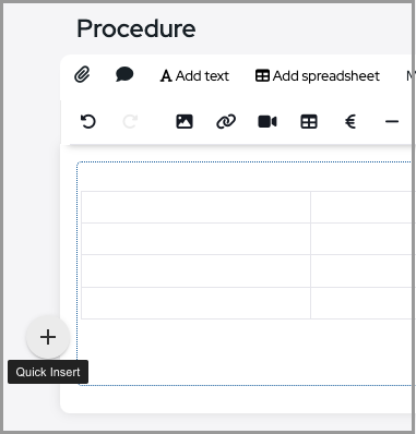 If the cursor is placed on the beginning of a new row a quick insert + button appears. It allows to add some of the elements directly to the row in addition there is a time-stamp option.