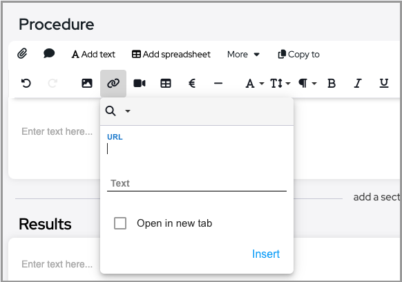 Insert link allows to add a URL as an added text or link an existing word to a URL by selecting it first and then clicking add link.