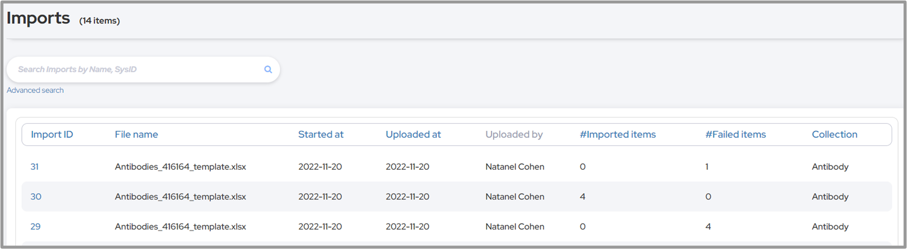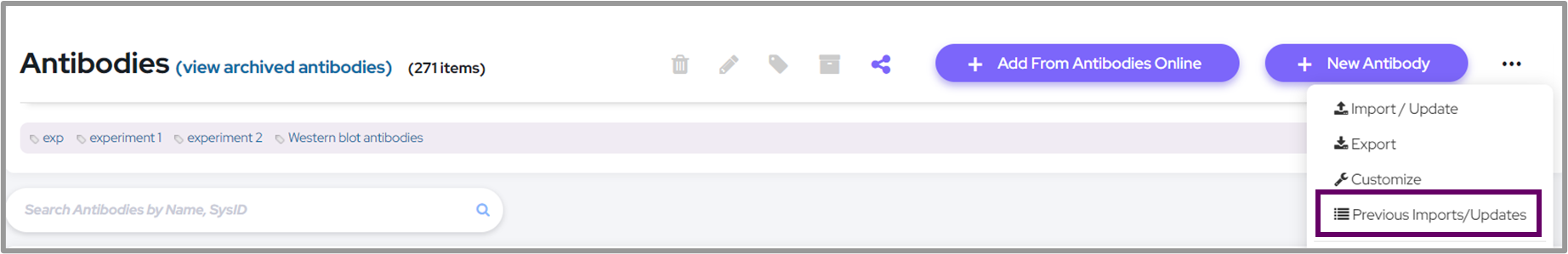 Click on 'Previous imports/updates' to get to a list view of all imports and updates made.