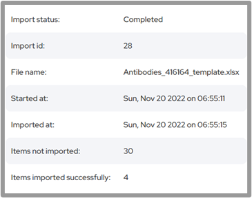 Follow your import progression and view the import/update history record of your bio-collections, stocks and equipment inventories with the import/update summary.