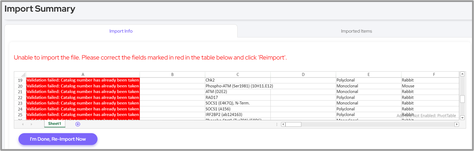If any error occurred during the import, you will also see a table with the option of amending those errors marked in red.