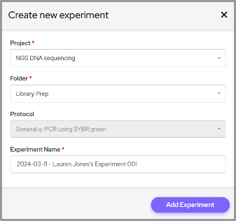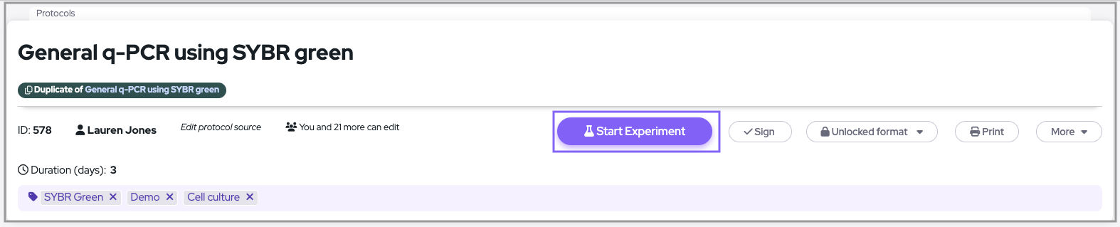 The new experiment will contain a copy of the protocol and this will allow us to use the templates from it. For example, if you have designed a form in the protocol, you can populate it in the experiment, if you added sample information you can choose the actual stocks you used for the specific experiment, in the steps element you can mark steps as completed and start the timer, etc.