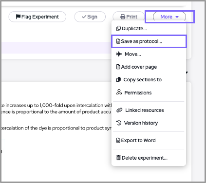 Guru Tips: If you have built an experiment that will be performed several times, you can save a copy of it as a protocol, saving you time not having to rewrite the entire procedure. In the experiment, click on More and select Save as protocol... The new protocol will be placed in your protocols list. |
