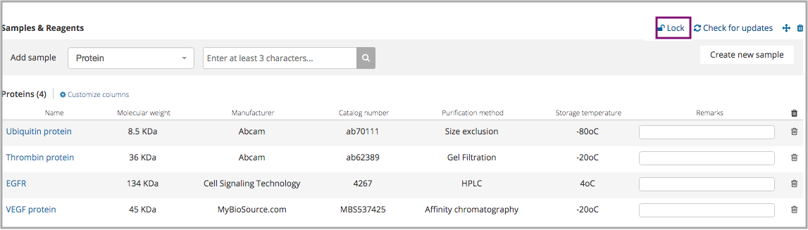 Once the samples are locked, other account members won't be able to add, remove or edit them. Only the protocol owner and admins are able to unlock the element.